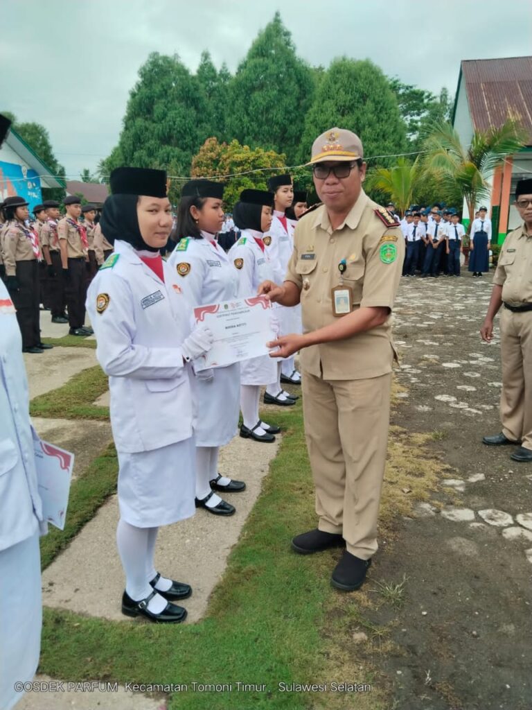 Kepala Sekolah SMPN 1 Tomoni Timur, Aris Ruruk, mengucapkan terima kasih atas kesediaan Camat Tomoni Timur untuk menjadi pembina upacara sekaligus menyerahkan piagam dan piala kepada siswa yang berprestasi dalam kegiatan non-akademik.