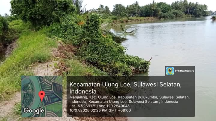 Hasil pemantauan di lokasi menunjukkan kerusakan parah pada pematang empang sepanjang ±150 meter. Struktur tebing sungai dalam kondisi kritis, dengan titik koordinat GPS -5.527036° / 120.284008° menunjukkan lokasi berada di zona merah risiko longsor.