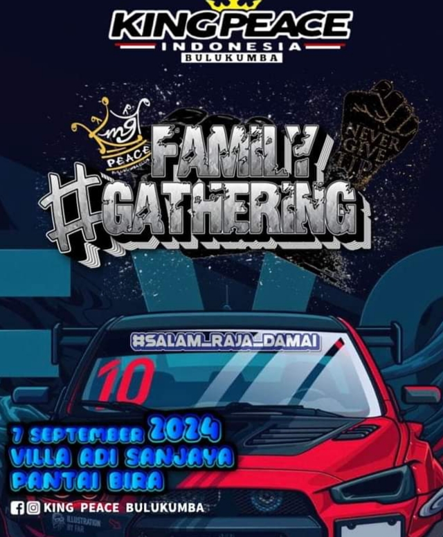 Beritabaru.com.Bulukumba – Komunitas King Peace akan menggelar **famili gathering** yang berlangsung meriah di Penginapan Adhi Sanjaya, Bira. Acara ini dipimpin oleh Ketua Kansa, Om Lukman, dan akan dihadiri oleh Wakil Bupati Bulukumba, H. Andi Edy Manaf, sebagai tamu kehormatan, Sabtu malam 07/09/2024.