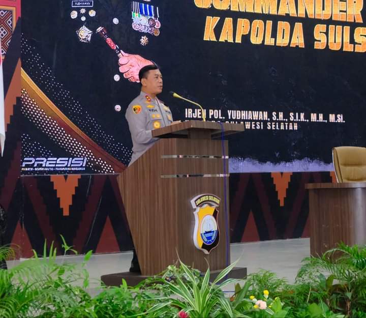 Beritabaru.com.Makassar, – Kapolda Sulawesi Selatan Irjen Pol. Yudhiawan S.H., S.I.K., M.H., M.Si. didampingi Wakapolda Sulsel Brigjen Pol Nasri, S.I.K., M.H. dan Irwasda Kombes Pol Ai Afriandi S.H., S.I.K., M.M., serta Pejabat Utama Polda Sulsel Melaksanakan Commander Wish di Aula Mappaodang Polda Sulsel, Kamis (03/10/24).