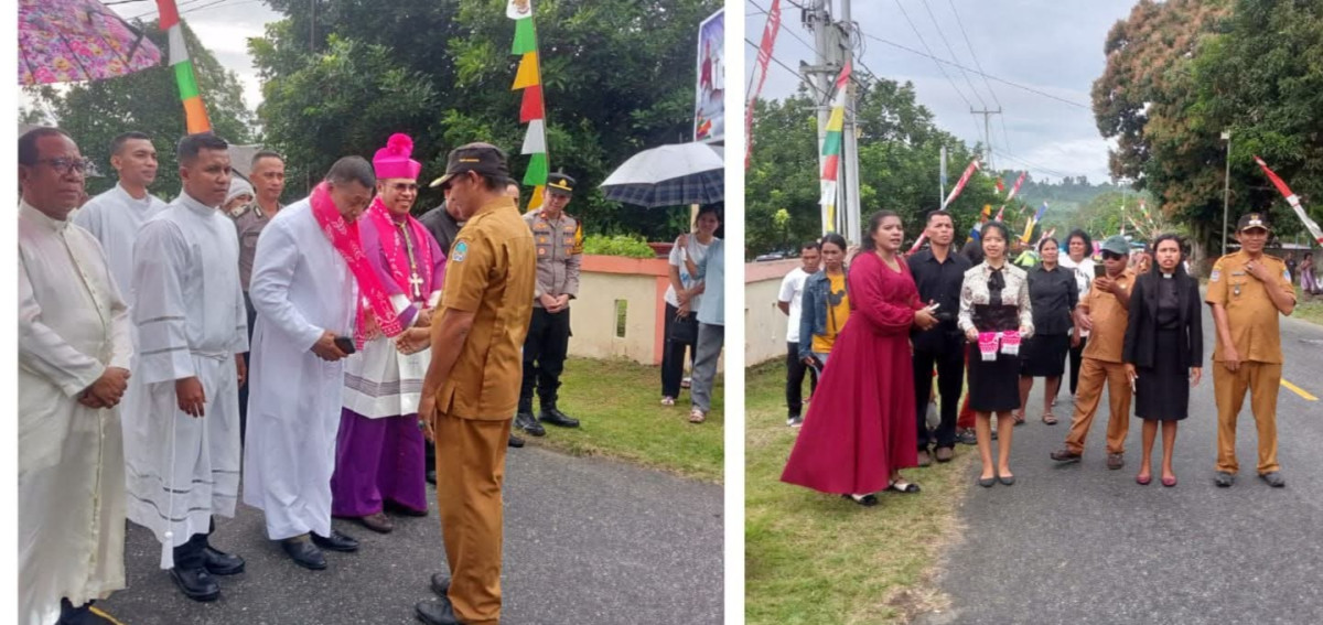 HAL-SEL – Wayamiga, Halsel – Dalam suasana penuh sukacita dan semangat kebersamaan lintas umat beragama, Kepala Desa Wayamiga, Kader Samual, bersama jajaran pemerintah desa turut ambil bagian dalam menyambut kedatangan Uskup MGR Seno Ngutra yang melakukan kunjungan kerja (kunker) di Kabupaten Halmahera Selatan (Halsel), Provinsi Maluku Utara (Malut) 4/8/2025
