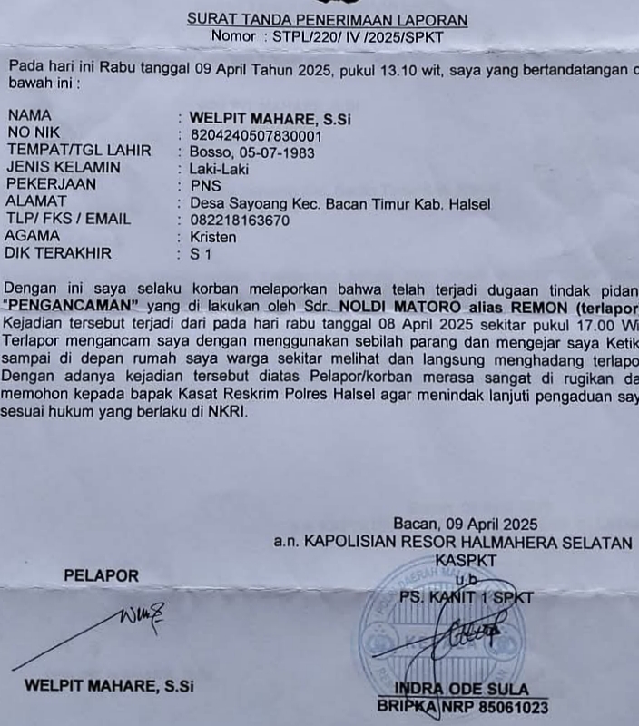 Pelaku berinisial Noldi Matoro, yang juga merupakan warga asli desa tersebut, dilaporkan ke Polsek Bacan Timur pada 9 April 2025 dengan nomor laporan STPL/220/IV/2025/SPKT. Dugaan penganiayaan ini terjadi sehari sebelumnya, tepatnya pada 8 April 2025.