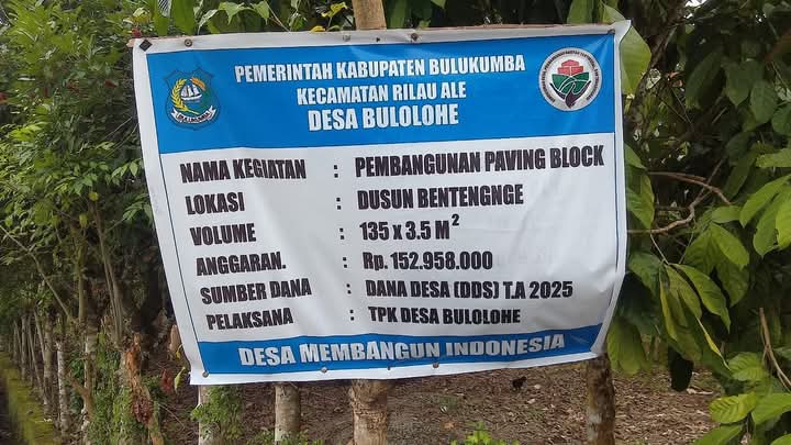 Bulukumba – Proyek pembangunan paving blok di Dusun Bentenge, Desa Bulolohe, Kecamatan Rilau Ale, Kabupaten Bulukumba, Sulawesi Selatan, menuai kritik tajam. Proyek yang dibiayai melalui Dana Desa (DD) tahun anggaran 2025 senilai Rp152.958.000 dengan volume 135 x 3,5 meter persegi, diduga dikerjakan secara asal-asalan dan jauh dari standar teknis yang semestinya.