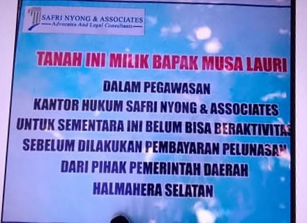 BeritaBaru.Com.Halmahera SelatanTanah milik Bapak Musa Lauri yang berlokasi di Desa Marabosse, Kabupaten Halmahera Selatan, kini berada dalam pengawasan resmi Kantor Hukum Safri Nyong & Associates. Pihak kuasa hukum menegaskan, untuk sementara waktu, lahan tersebut tidak boleh dijadikan objek kegiatan apapun, termasuk pengukuran, pematokan, pembangunan, atau bentuk aktivitas lain yang dapat mengubah status quo tanah tersebut.